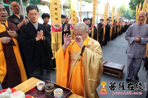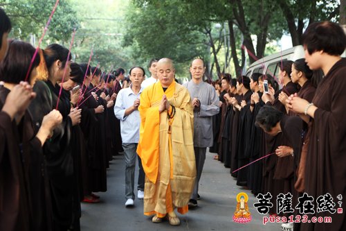 福慧寺住持道元法师迎接三圣像(图片来源:菩萨在线 摄影:妙雨)