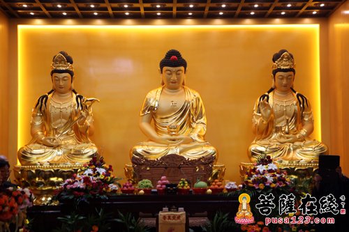 中间阿弥陀佛,左边观世音菩萨,右边大势至菩萨,庄严的西方三圣像安座于念佛堂正中,金光闪闪,万德庄严,慈悲地俯视众生,令人望而生敬(图片来源:菩萨在线 摄影:妙雨)