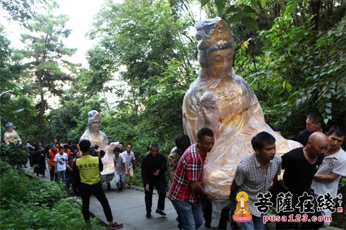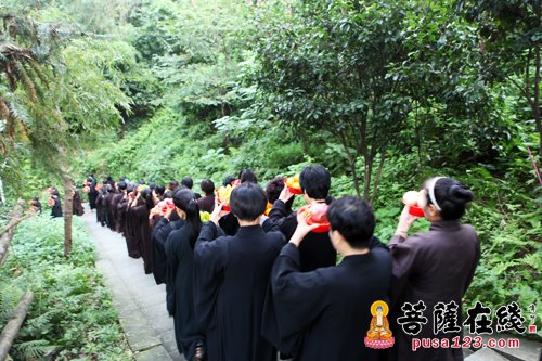 千余名信众在寺院僧人的带领下,手持鲜花,供果,列队从大雄宝殿徒步至寺院山角下迎接庄严的宝像(图片来源:菩萨在线 摄影:妙雨)