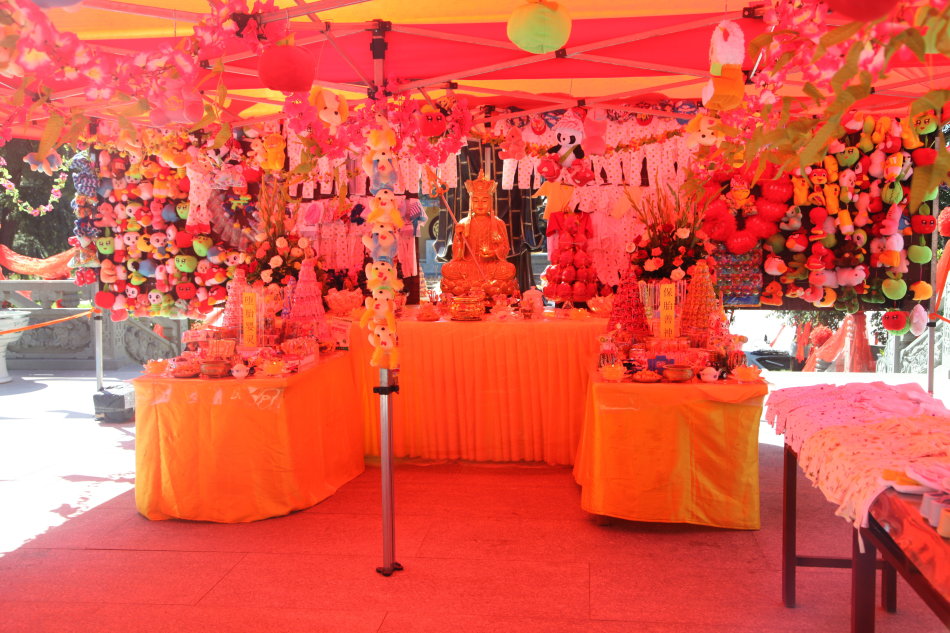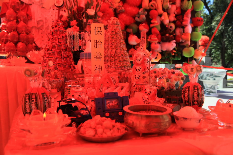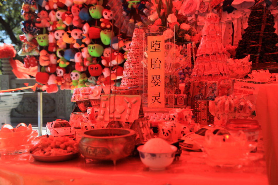 2015年9月5日上午7:30,大雄宝殿法会现场布置庄严,殿堂外设立地藏菩萨法坛,坛上陈放婴儿服饰玩具、百味饮食、各种供品及堕胎婴灵莲位,整个坛场庄严肃穆。大殿内,法师们口诵真言、意专观想,信众们唱腔淳厚、威仪庄严,众斋主佛前礼拜、忏悔业障,地藏七法会在炉香赞的梵呗声中正式拉开帷幕。