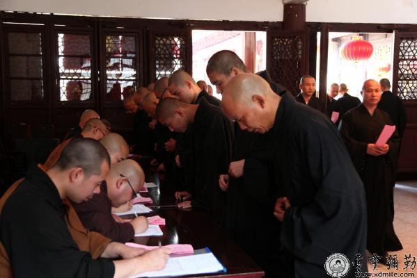 上午,新戒佛子在开堂、引礼师们带领下在寺山门外前结界,通过如法如律羯磨仪式结界立标。新戒佛子从即日起,除为父母师长、三宝事,不得越此界限,直至戒期圆满后方可出界。结界结束后,进行了戒期第一堂法事投单挂号,新戒们从弥勒宝殿10人一班随引礼师父在寺内客堂礼佛三拜,顶礼诸引礼师后,引礼师与新戒佛子以一对一的问答方式,登记每位新戒子的情况。新戒佛子一一作答,介绍了各自的求授净戒因缘,最后,排班返回大殿。