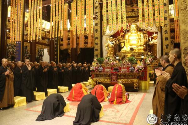 晚上,在弥勒宝殿举行净坛结界仪式, 慧深法师、广能法师、持定法师拈香主法,并手执杨枝遍洒甘露,严净坛场,引礼师们并引领着众新戒佛子诵经持咒依次来到韦陀、伽蓝、祖师、监斋菩萨等处唱赞、礼拜、宣疏祈愿十方诸佛护持坛场,戒期殊胜圆满,新戒佛子得上品上戒。