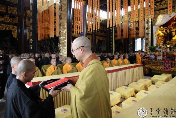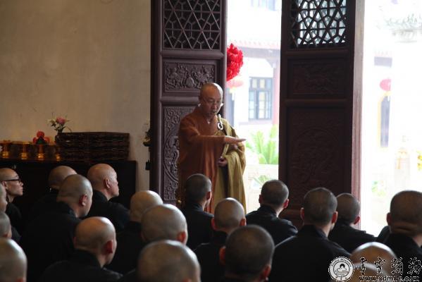下午,新戒佛子依次迎请了知客继慧法师、监院持定法师,两位法师分别作了慈悲开示。接着,到颂古堂迎请浙江省佛教协会会长、本寺方丈怡藏大和尚在法堂登与新戒初见,大和尚引用《华严经》中的“戒是无上菩提本”的偈子开示了受戒的意义,戒乃成佛的根本,大和尚不仅引经据典开示了戒的意义,同时还希望大家在一个月的戒期内放下万缘,求得无上戒品。