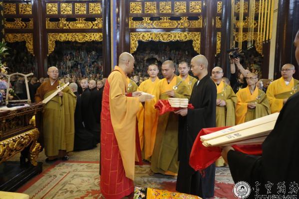 下午,在迎请和尚之始,开堂师父教戒子们如何审视自己的身心,只有身心检视好了,才能谈发心。今生能得人生、能出家,是很不容易的事情,即使有一些小毛病,只要忏悔,一定是可以改正的。随后,隆悟法师、法空法师带领6名新戒代表迎请本山方丈怡藏大和尚,梵音缭绕,诸佛慈临,大和尚拈香登座说法。隆悟法师宣示整个戒期堂规律仪,虽然给戒子们制定了种种规约,但是规约的根本是在于守护戒子们的根门,让大家能收摄六根,安心求戒。诸戒子听之欢喜,齐声作答“依教奉行”。然后,大和尚向开堂大师父交授香板,并依次传递香板给诸位法师。接着,开堂、陪堂法师分东西两序依次给每位两击香板,两击香板是为给戒子消业增福慧。去除往昔所造的恶业,增长今时受戒的福慧。