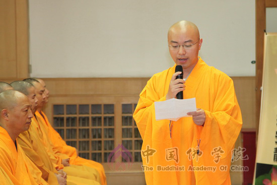 国家宗教事务局四司赵忠海副司长作了讲话。他首先向入学的新生表示衷心的祝贺,并向同学们提出了以下几点建议:一、中国佛学院强调“学修并进”,学与修不能偏废。在学院四年的学习中,修为更为重要,要不断地坚定自己的信仰,处理好学与修的关系;二、在专攻上要有所体现。佛教“八宗并立”,同学们在广泛涉取知识的同时,在某一个专业领域要更为投入,做到“术业有专攻”。三、在生活实践中体现自己的学业和修养。同学们在服务于大众的同时,要努力增加自己的学术素养,提升自己的修行。