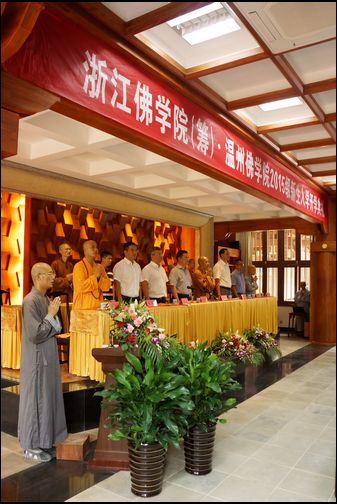 开学典礼由温州佛学院副教务长则庄法师主持。上午9:00时,开学典礼在高昂的《中华人民共和国国歌》声中正式拉开序幕,出席典礼并在主席台上就坐的领导和法师有:浙江省民宗委副主任陈振华先生,温州市委统战部副部长、市民宗局局长陈锋进先生,浙江省民宗委宗教三处副处长贺再军先生,温州市民宗局宗教一处处长李海波先生,文成县委书记汪驰先生,文成县委副书记章寿禹先生,文成县委常委、县统战部部长吴育民先生,文成县民宗局局长季成夏先生,浙江省佛教协会副会长、浙江佛学院(筹)副院长、温州佛学院院长、温州江心寺方丈智明大和尚,温州佛学院副院长兼教务长、安福寺住持达照法师,温州佛学院副院长、温州太平寺住持万如法师,温州佛学院副教务长则生法师,温州佛学院副教务长则庄法师,温州佛学院法师戒修法师、门学法师。