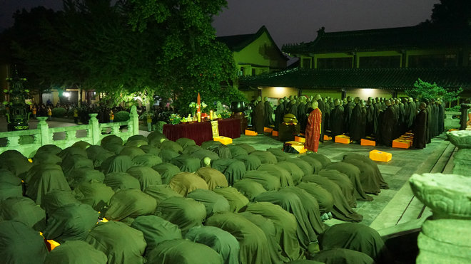 傍晚时分,明月初现,拜月台上香果累累,“南无月宫太阴尊天菩萨”牌位已竖立案前。6时30分,香烛供灯点亮,引礼师鸣磬击法鼓,缁白二众千余人于月下肃然静立。东林寺方丈大安大和尚莅临拜月台前,主持拜月法会。大和尚虔诚拈香,恭请太阴尊天菩萨降坛,随后大众同诵《药师琉璃光如来灌顶真言》。唱诵毕已,僧众分东西两单拜月,维那举赞曰:“云开空净,独露婵娟,皎洁无暇体自圆,一月一周天,普照无边,恩泽被大千。”皓月当空,秋风习习,万里清辉之下,缁白二众诚祈太阴尊天菩萨赐福人间,普愿清凉甘霖遍洒之处,容摄大千芸芸众生,免受贪、瞋、痴热火逼恼,安获吉祥。