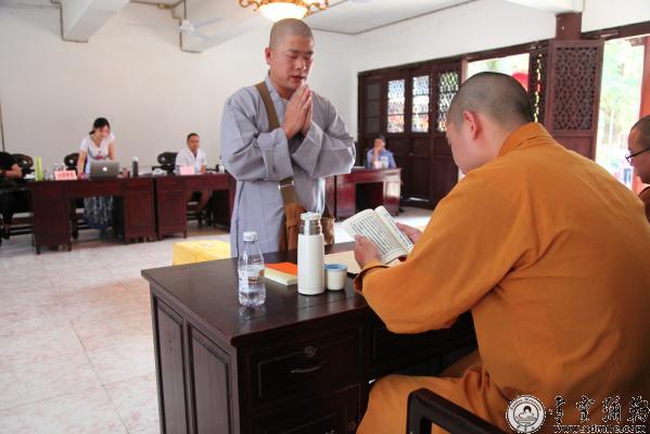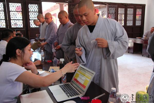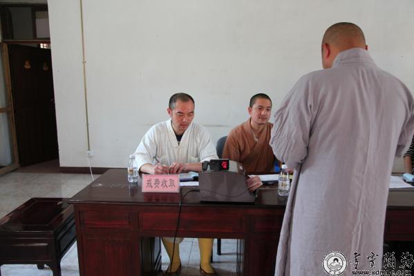 寺内客堂,由东往西设立了五个工作组,引礼法师们按照各自的岗位职责,有条不紊地忙碌着。新戒们在引礼师的引导下,首先来到了行李检查组、然后到证件检查组,在公安部门的配合下,由省、市佛教协会核实身份、户籍等相关信息,接着到功课考核组、戒费缴纳组、用品发放组、合格寄单组的要求,办理有关手续。新戒要经过检查行李、检查证件、考核功课、戒费缴纳、领取物品等流程才能正式寄单,提前来的戒子,只能算是挂单。以上几个步骤,只有上一步骤通过,才能进行下一步骤。