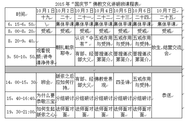 4、课程分两阶段:第一阶段,10月1日--3日,面向初入门者;第二阶段,10月4日--7日,针对有较好佛学理论基础的佛弟子。各人可根据自身情况,安排学习时间。