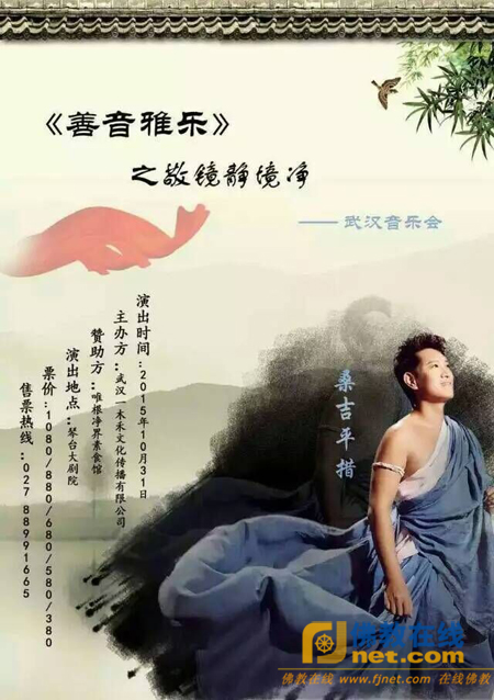 2015年10月31日晚,武汉琴台大剧院将迎来一场至善至美的心灵音乐会“东方梵音王子桑吉平措‘善音雅乐之敬镜静境净’”,这也桑吉平措善音雅乐继北京保利歌剧院成功举办之后,全国巡演的第二场——武汉专场。来自于燕都京城碧云天下的“天籁王子 桑吉平措”的又一场用爱和音乐诠释心灵之光的音乐会。将给你带来全新的感受和体验。
