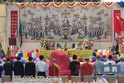 深秋的澳门时逢吉日,天高云淡。活动主会场新丽华广场被布置的庄严静肃,幡帐飘扬,梵音萦耳。四周搭建的8个工作棚内,上百名义工协助信众填写“佛缘之路”祈福卡、办理皈依登记。10时许,祈福法会开始,澳门佛教中心协会理事长、无量寿功德林住持、香港佛学会会长释戒晟大和尚庄严登台,主持坛场洒净,港澳常住高僧大德为“佛缘之路”前站收集到的所有“心愿菩提卡”进行加持。随后,活动按照佛教仪轨,诵经礼赞完毕,由参与活动嘉宾共同为大型翡翠雕像《释迦佛应化事迹图》(亦称“心愿佛”)澳门站活动揭幕。