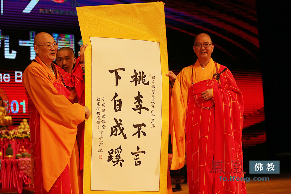 学诚大和尚为闽南佛学院现场赠送墨宝,圣辉院长代表佛学院表示感谢(图片来源:凤凰佛教 摄影:张玺)