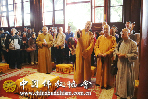 传放法师等一行首先在中国佛教协会国际部主任普正法师的陪同下参观了北京广济寺,并在大雄殿内礼佛三拜。随后,全柏音副秘书长在广济寺怀远堂亲切会见了传放法师一行。