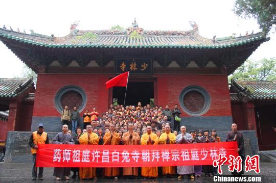 风中菩提”朝圣团一行在少林寺门前合影(图片来源:中新网 摄影:周小云)