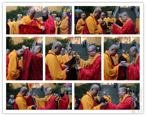 上午八点半,演通法师法驾至山门,诸山长老大德和玉泉寺两序大众合十恭迎,中国佛教会副会长、福建鼓山涌泉寺方丈普法法师为演通法师搭衣,中国佛教协会副秘书长、杭州灵隐寺方丈光泉法师为演通法师挂珠,浙江省佛教协会副会长月真法师为演通法师授具,杭州径山万寿寺方丈戒兴法师为演通法师授钵,杭州净慈寺方丈戒清法师为演通法师授锡杖,杭州永福寺方丈念顺法师为演通法师授佛尘,杭州法净寺住持惟尘法师为演通法师授如意。