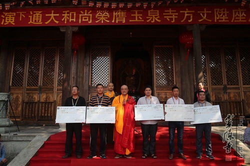 庆典现场还进行了慈善捐赠,演通法师还现场向建德市梅城镇、寿昌镇等乡镇的敬老院捐赠人民币十万元,表达玉泉寺对孤寡老的关心。