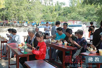 一些人领走了素餐,还有一些人留在现场用餐。(图片来源:凤凰佛教)