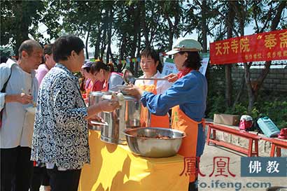 奉斋义工为受斋者盛汤(图片来源:凤凰佛教)