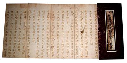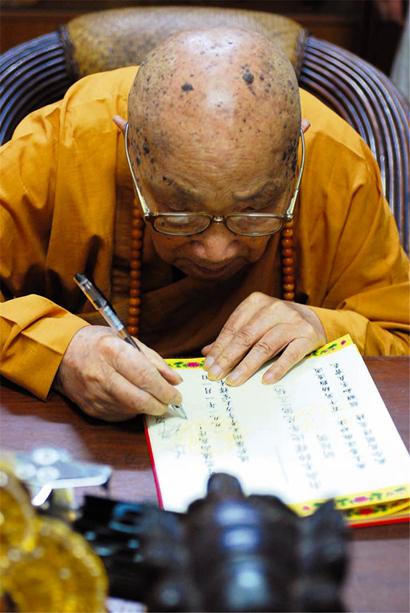 在清苦的生活下,长老每天坚持用手尖与舌尖的鲜血,恭写《华严经•普贤菩萨行愿品》、《金刚经》、《楞严经》等经典。日书五、六百字,共计十九卷血经,过二十万字。可惜因战乱频发,大部分血经已经失传,唯有《普贤菩萨行愿品》因缘殊胜,历时五十年辗转浮沉,最终回到了长老身边。