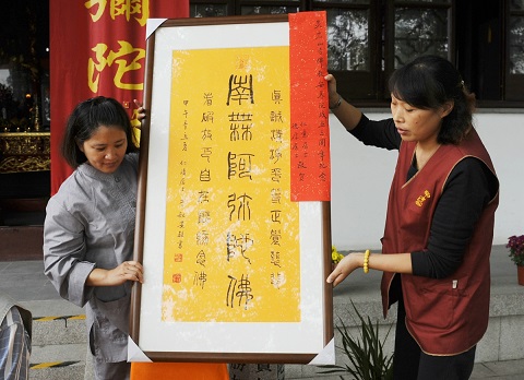 苏州灵岩山寺佛教安养院成立三周年庆典活动在大家的合影中圆满结束,大众欢喜。新中国国礼艺术大师李淑安为大会献墨宝,锦上添花。