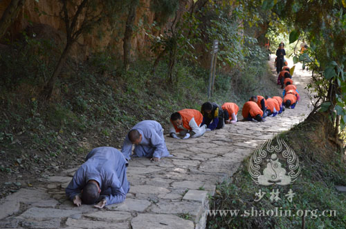 随后,少林寺延宗法师和延侦法师带领朝圣团从寺院锤谱堂三步一拜朝圣达摩洞。延宗法师勉励朝圣团:“大地上承载着人们的脚印,可我们用我们的脸庞亲吻大地,当你体会到与大地融为一体,这就是修行”。