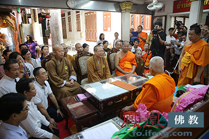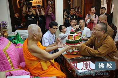 中国佛教功德主用各种精美供品供养代僧王及泰国长老。凤凰佛教报道团队代表凤凰网友供养了代僧王两大包从中国千里迢迢带来的中国素食。代僧王愉快接受了供养,并表示了感谢,他还回赠了海巡团每位团员一套精美礼品。