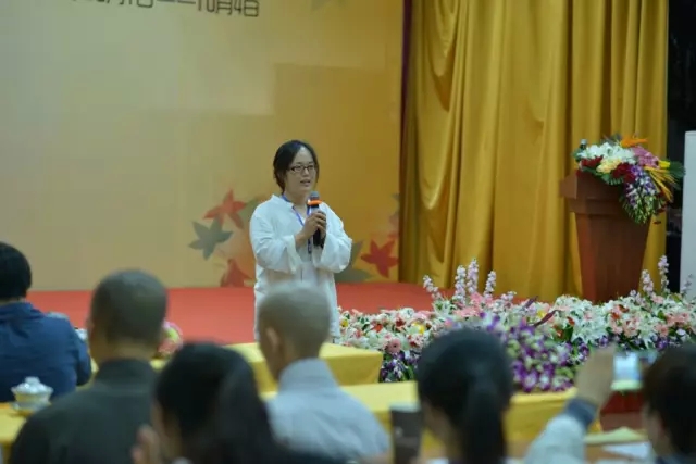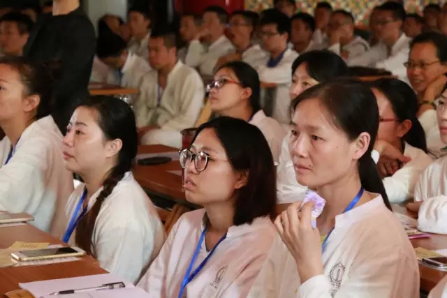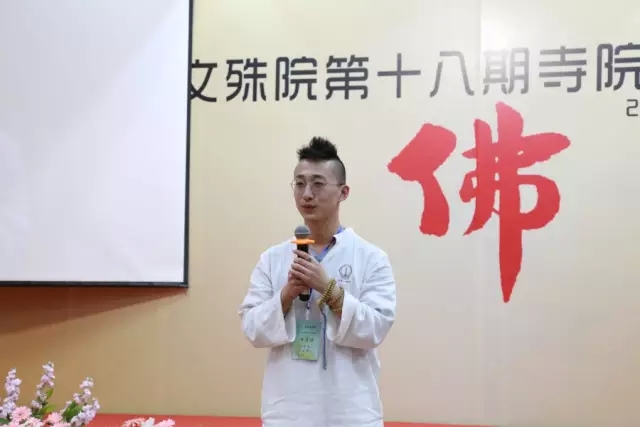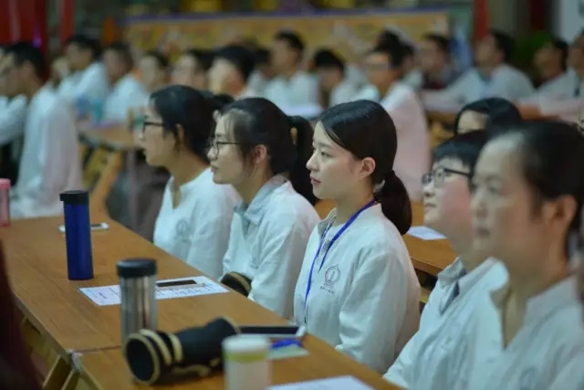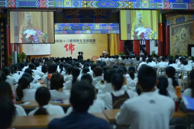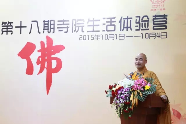 随后,空林佛学院讲师果辉法师作为本期体验营辅导法师代表上台发言。法师说:“三天时间零距离接触佛法,大家各有收获。希望大家能将体验延续到以后的工作和生活中去,更加深入地学习佛法,把对佛法的感悟分享给更多的人。”法师的话语亲切、朴实、自然,代表了文殊院全体僧众对营员的祝福、期望。 接着,一段10分钟的视频带领大家重温三天来那些精彩、难忘、温暖、感动、沉思的瞬间。从报到到过堂,从禅修到传灯……一张张年轻的面孔充满喜悦,一个个微笑的脸庞饱含欢喜,感动的泪水盈满眼眶。