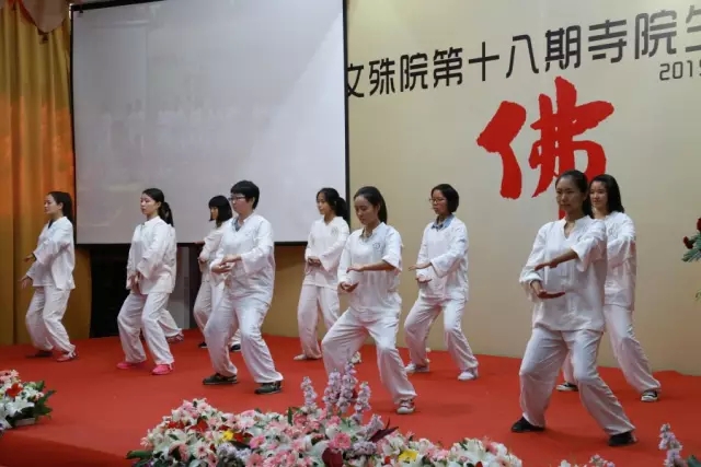 而接下来的两组节目表演则展现了营员们的多才多艺。11位女营员表演《太极禅》,她们的动作如惊鸿、似飞燕,沉缓有度、动静相宜,赢得现场热烈掌声。 欢喜组、奉献组、向善组等表演诗朗诵《待你因缘来到》:“待你因缘来到,随我修行可好。高挽青丝成髻,不教红尘相扰……”,朗朗上口的美文让大家惊艳。两个寓教于乐的节目,从编排到演出只用了短短两天时间,实属不易。