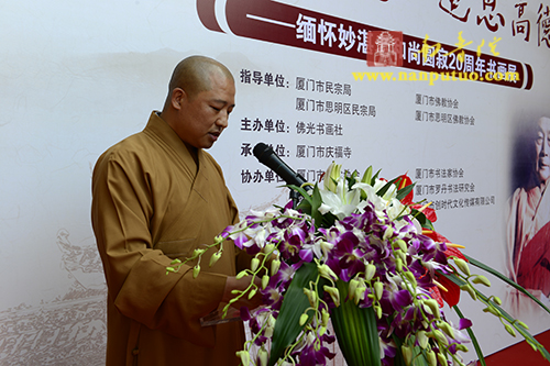 为了纪念妙老的丰功伟绩,发扬妙老的伟大精神,10月12日上午9时30分,厦门庆福寺与佛光书画社特举办“永沐佛恩、追思高德”缅怀妙湛老和尚圆寂20周年书画展活动暨妙老塑像揭幕仪式。出席此次活动的有市、区各级领导,诸山大德,协办单位市美术家协会、市书法家协会、厦门闽台书画院、张晓寒美术研究会、罗丹书法研究会以及厦门佛教各寺院负责人,闽南佛学院校友和书画界知名人士等嘉宾。开幕式由厦门市佛教协会副会长兼秘书长、虎溪岩寺方丈净心法师主持。