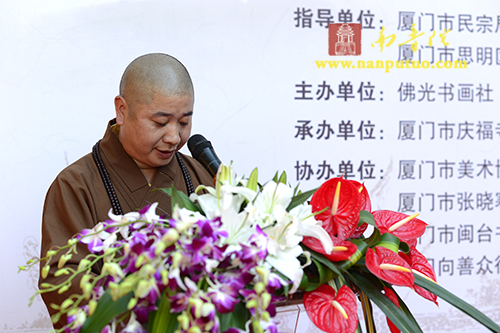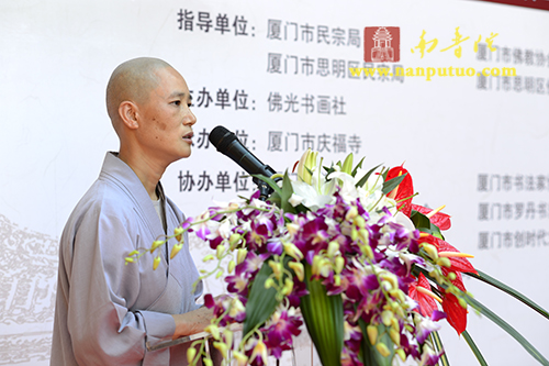 开幕式上,厦门市民族与宗教事务局黄镇辉副局长,中国佛教协会副会长、福建省佛教协会副会长、厦门市佛教协会会长、南普陀寺方丈则悟大和尚分别致辞。赞叹妙老之殊胜功德,发扬妙老之慈悲精神;以佛法滋养书画,以书画弘扬佛法,提升人文精神,促进社会和谐;为共同缔造“美丽厦门•幸福思明”作出积极的贡献。随后,庆福寺住持、佛光书画社社长心量法师致答谢词。