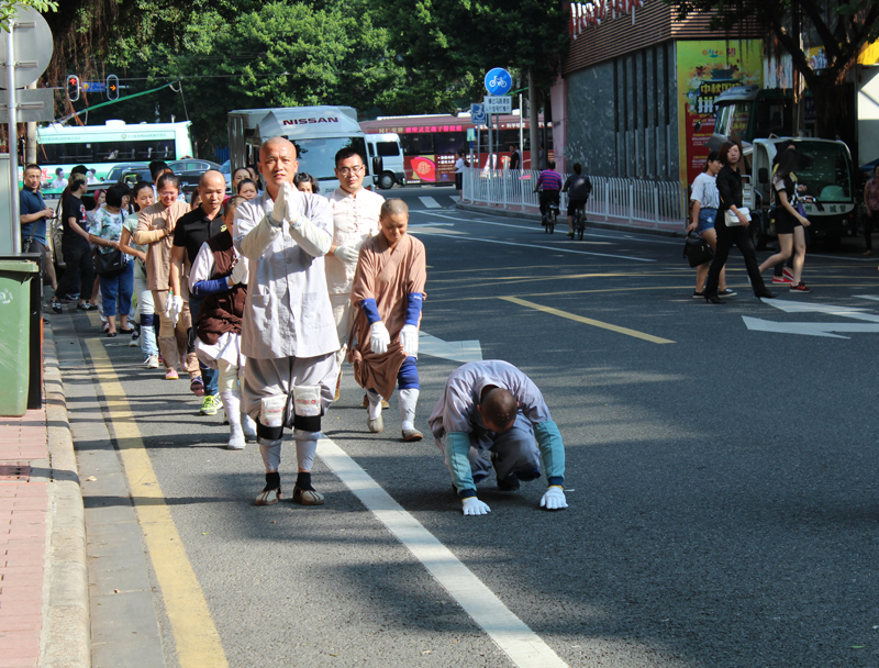 10月9日上午,如润法师一行已经拜到广州公园前,一轮朝阳升起在羊城的天际线,为行愿的队伍洒下