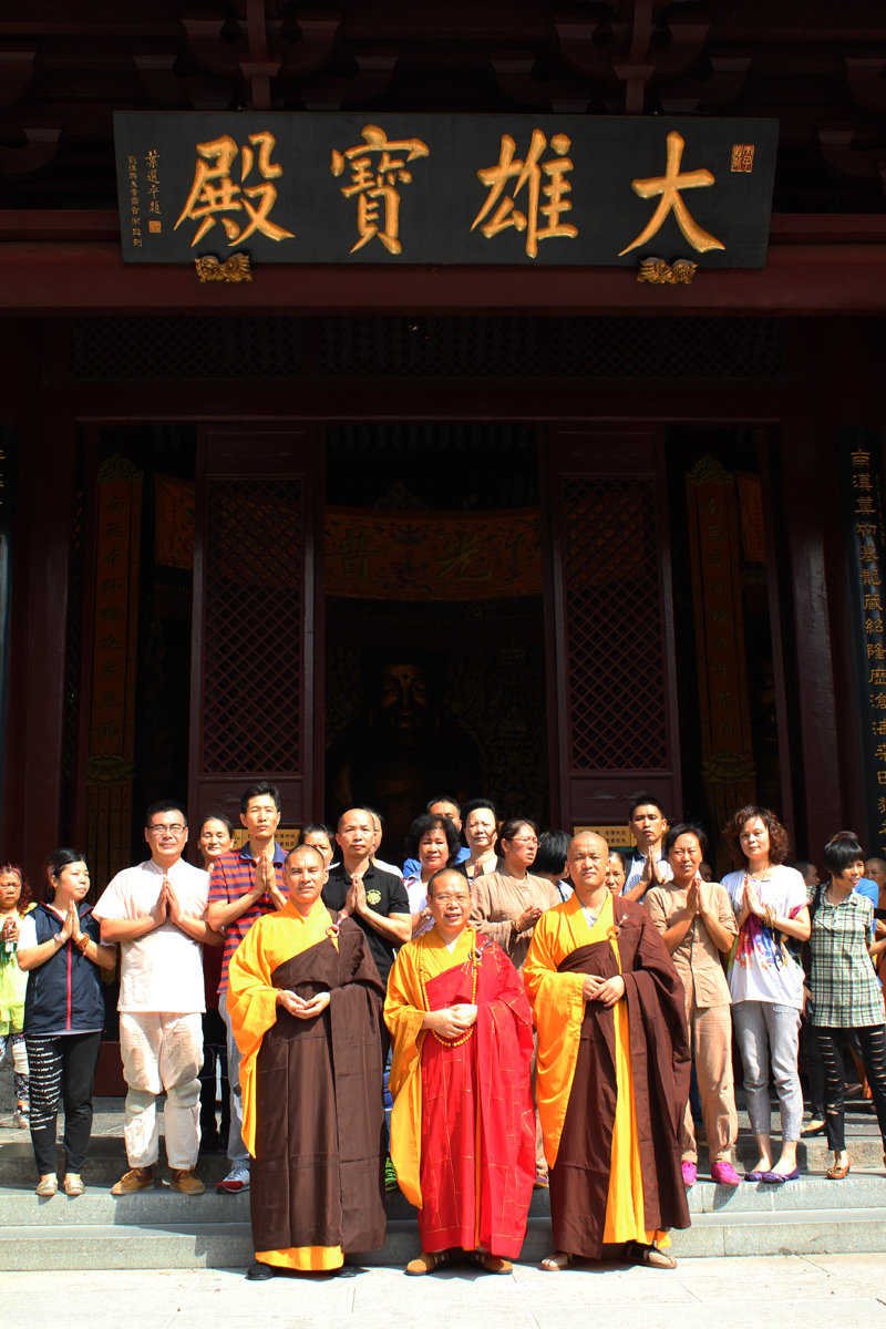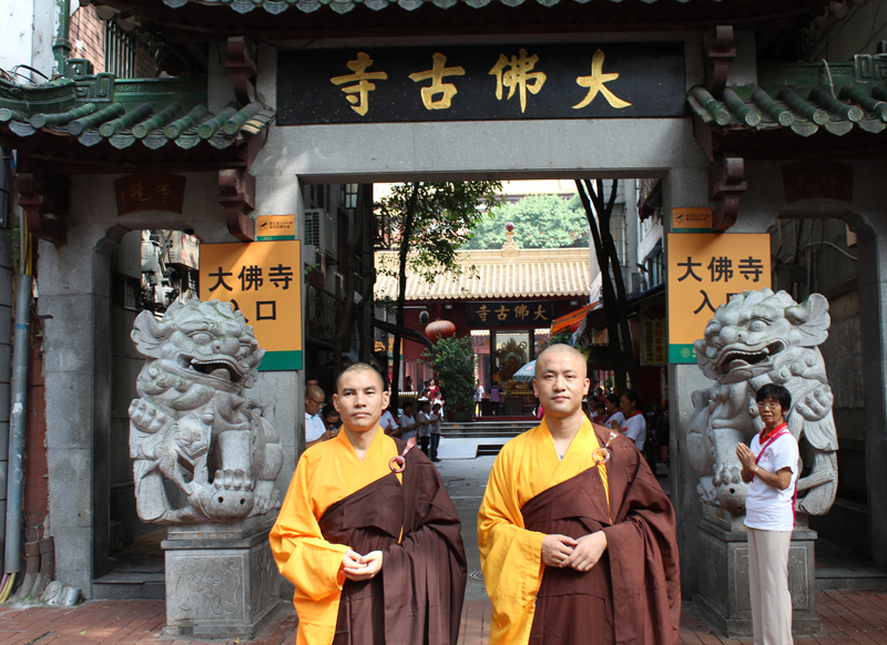 欣闻行者至,众生俱欢颜!大佛寺义工已经例队排班,在牌坊恭候,两位法师披挂褡衣,在大佛寺牌坊下合影留念。