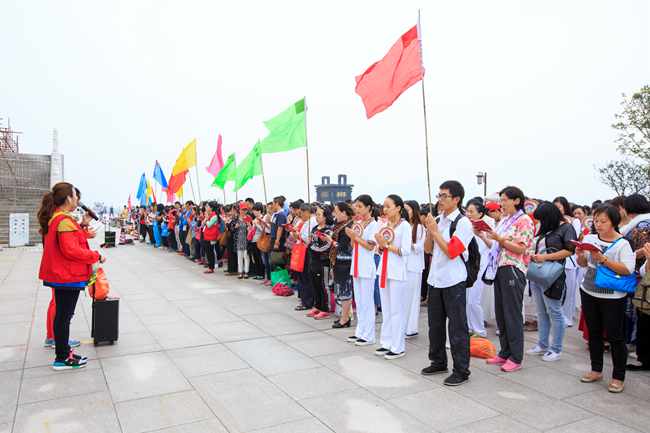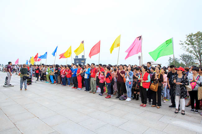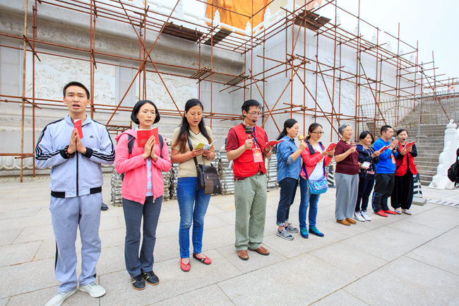 上午十点多,信众们在净土苑莲花广场集合整队,然后分成若干小组,在各组负责人带领下步行上山。