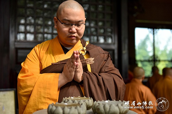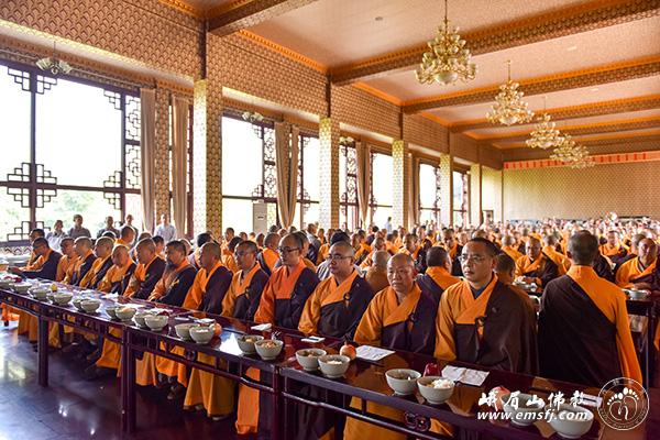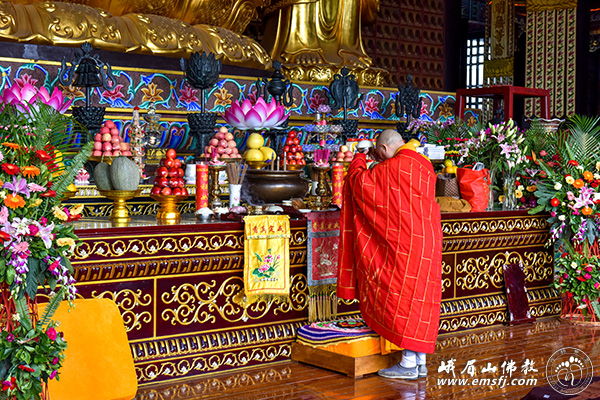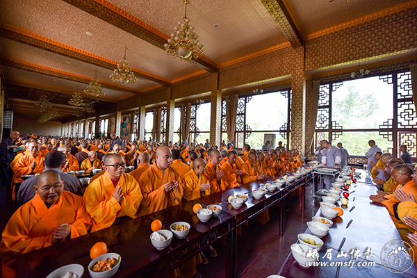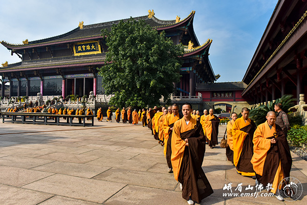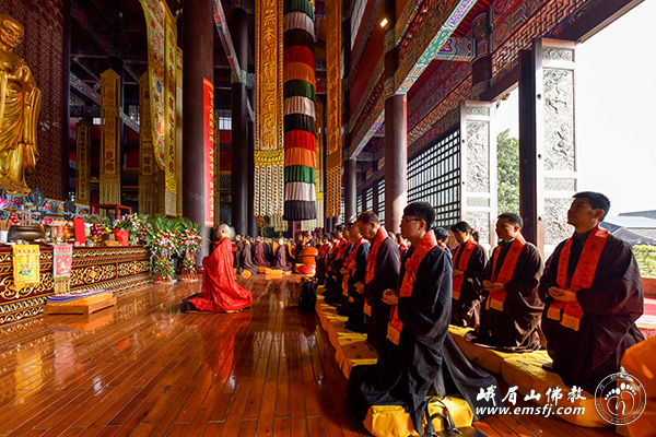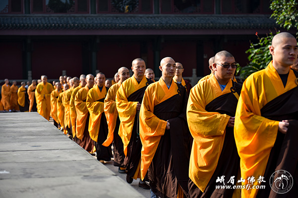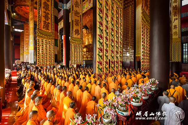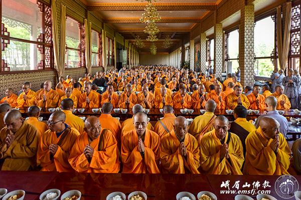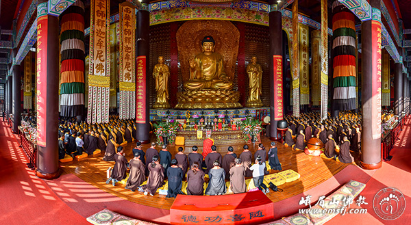 秋高气爽,阳光普照。2015年10月28日上午,峨眉山大佛禅院隆重举行千僧斋法会,千余僧众在大雄宝殿内共同为供斋者以及众生祈福,并祈祷世界和平、社会和谐、人民安康。