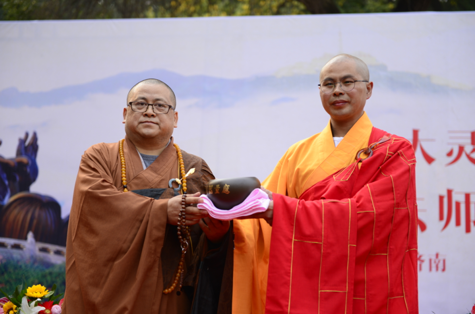 授法具仪式结束后,灵岩寺监院法如法师出位礼请弘恩法师住持山东大灵岩寺,领众熏修,弘法利生。弘恩法师云:弘恩惭愧,承大众所请,即刻晋院,追随诸师,精进修行,住持正法,爱国爱教,利乐有情,不负众望。