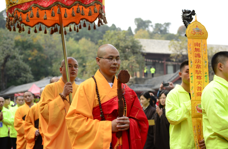 在晋院牌的引导下、诸山大德和观礼嘉宾信众的簇拥下,弘恩法师手捧如意,缓步走入山门,行至天王殿,天王殿中弥勒含笑,韦陀尊天,威风凛凛,弘恩法师拈香说法,礼佛三拜。