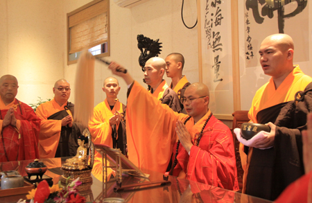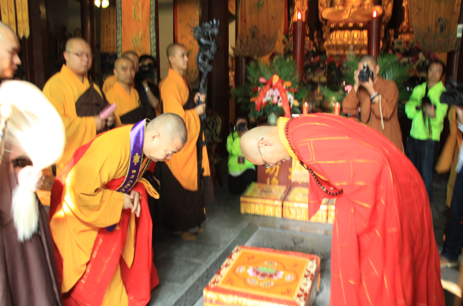 在大雄宝殿内,山东省佛教协会副会长、青岛湛山寺住持心见法师为弘恩法师送位。弘恩法师合掌说法:天上天下无如佛,十方世界亦无比。世间所有我尽见,一切无有如佛者。说毕礼佛三拜。