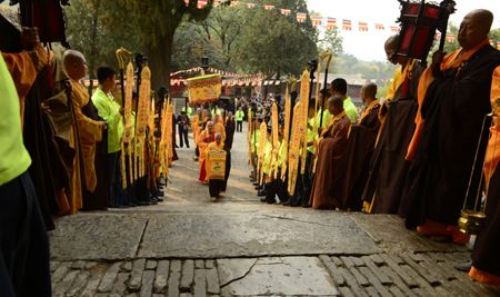 佛门盛事,因缘殊胜。上午九时许,弘恩法师法驾至山门广场,诸师大众两序云集,合十恭迎。山东省佛教协会副会长、青州广福寺方丈本悟法师送衣,北京市佛教协会常务理事、北京药师寺方丈性然法师送钵,山东省佛教协会副会长、烟台龙口南山禅寺方丈真龙法师送挂珠,青岛市灵珠山菩提寺住持妙智法师送拂尘,青州市龙兴寺住持妙严法师送具,临沂市兰陵县灵峰寺住持慧悟法师送龙杖,枣庄市峄城区青檀寺住持心安法师送锡杖,济宁汶上宝相寺住持正德法师送如意。