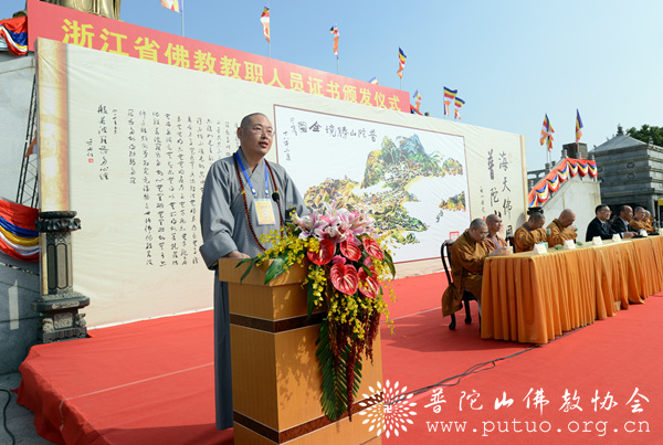 图15:舟山市佛教协会会长、普陀山佛教协会副会长净旻法师代表首批获得证书的僧人作表态发言