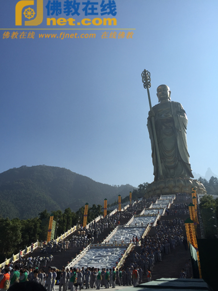 来自北京、天津、上海、广东、浙江、山东、吉林、安徽等全国30省市的1580名祈福团成员在法师带领下共诵《地藏菩萨本愿经》,供灯祈愿,在99米地藏菩萨圣像前,千人求授皈依,三步一拜朝礼地藏菩萨并回向圆满。