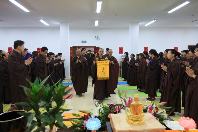 八时十分,大众于客堂会议室对面排班,口诵本师名号静候法师的到来。在引礼师的带领下,居士代表手持香、花、烛迎接法师入场。二十分许,法师缓缓步入堂中,拈香礼佛,敷座说法。