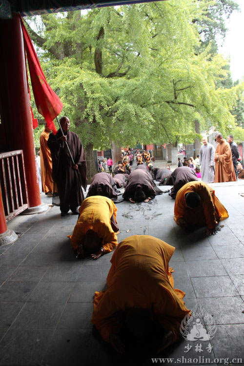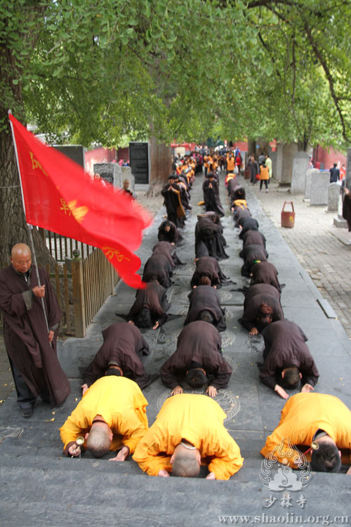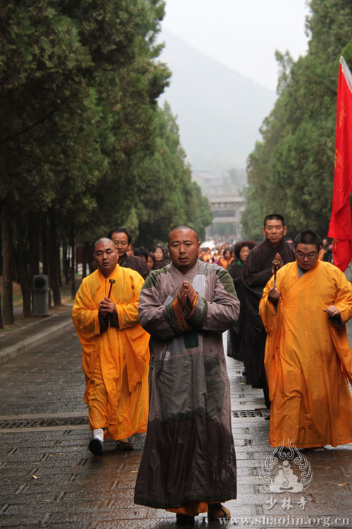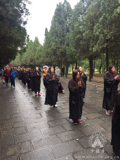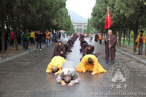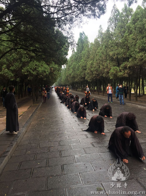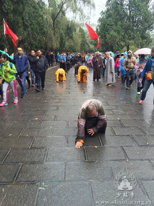 2015年10月25日上午,由河南许昌白兔寺发起的“风中菩提·朝拜少林寺之行”的近两百名信众,在释延极法师的带领下,冒雨三步一拜朝圣禅宗祖庭少林寺。