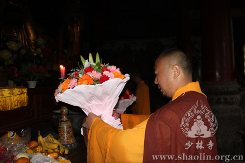 许昌白兔寺延极法师在少林寺大雄宝殿内虔诚供花