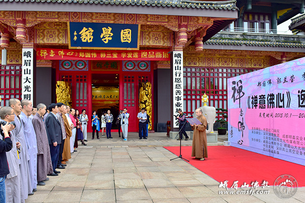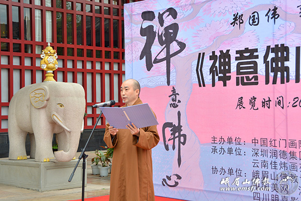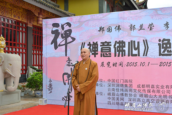 仪式开始由心定法师致辞,他代表峨眉山佛教协会对画展的开展表示热烈的祝贺,他说:“自佛法西来,佛教文化就与中国书画艺术结下了不解之缘,佛教籍书画以像表法,书画亦丰富了表现形式与内容,二者相互增上,共同推进社会进步与文化发展。三位艺术家创作之禅画,正是这种关系的体现,他们的画作以佛教教义为基础,清新隽雅,充满佛风禅韵,体现了佛陀的慈悲智慧及禅宗祖师的洒脱自然,此乃以艺术作佛事,发人净信、同趣佛道。”最后,他期待各位书画家常来峨眉山书画院开展禅修体验与艺术交流活动,举办各种形式的书画展,展示自己的才能,共同把峨眉山佛教文化事业推向前进。