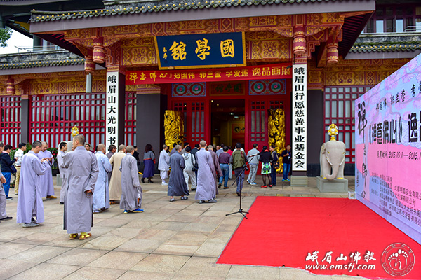 峨眉山佛教网消息:2015年10月1日,郑国伟、郭兰莹、李爱莲《禅意佛心》逸品画展在大佛禅院国学馆举行并举行开展仪式。中国佛教协会副会长、峨眉山方丈永寿大和尚,峨眉山佛教协会副会长心定法师、满霖法师,郑国伟、郭兰莹、李爱莲等来自全国各地的书画家以及峨眉山佛协部份僧职员工参加仪式。