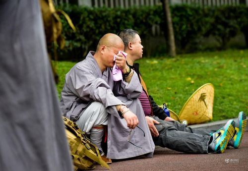 “行脚”僧人的衣服被汗水打湿。华西都市报 吕甲 摄