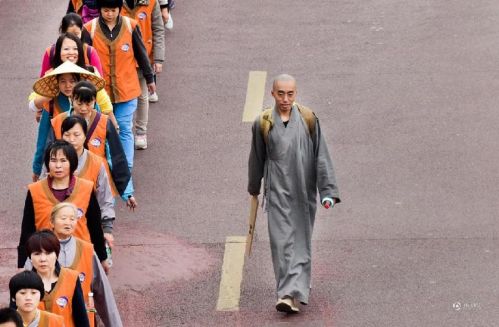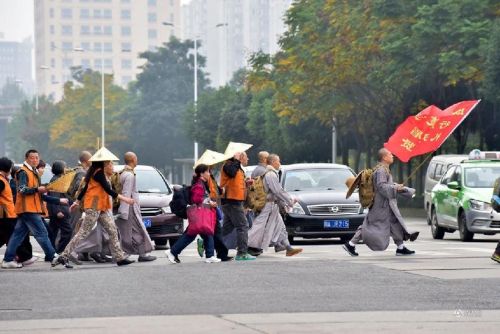 11月19日,成都,大慈寺50多名僧众从春熙路出发,僧众们背包简行,饿了吃干粮,累了打坐诵经,他们计划用8天丈量大地,从成都行脚到峨眉山金顶,全程180公里,每天步行3万多步。