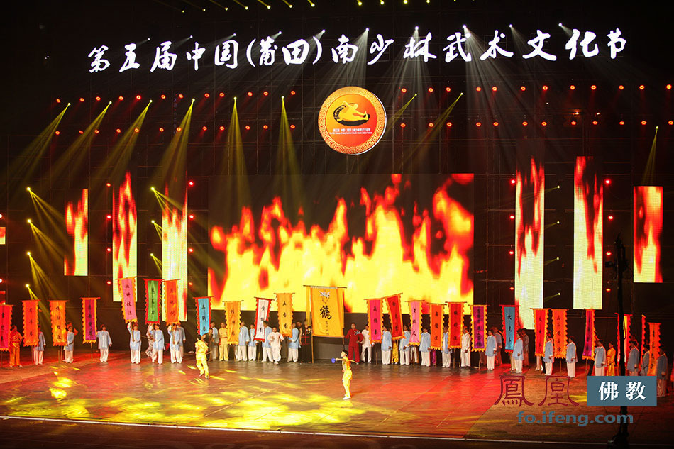 凤凰佛教莆田讯 少林功夫、莆田南拳......11月8日晚,来自南少林寺的少林武僧们及福建等全国各地的武林高手精彩亮相第五届中国莆田南少林武术文化节开幕式。来自海内外15个代表团、100多位高僧大德在莆田市万人体育中心出席观看,上万观众共襄盛举。