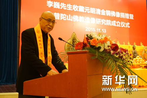 观音宝像捐赠者、北京东方瑰宝艺术品有限公司董事长、著名佛像收藏家李巍致辞:找寻和收藏佛像仅仅是一个开始,后续的研究、展示、宣传、修复和保护工作则更为重要,但是找寻和收藏已经耗尽了我毕生的精力和财力,在后续的工作上我已有些力不从心,而“普陀山佛教造像研究院”的成立可以更好的完成这些尤为重要的后续工作。我相信这些弥足珍贵的佛教造像可以在普陀山这方佛教净土中发挥出他们应有的价值,在这里这些佛像也会得到最好的呵护,让这些标志人类文化历史的璀璨明珠在这里绽放光辉,永久的向更多的世人展示他们的风采。
