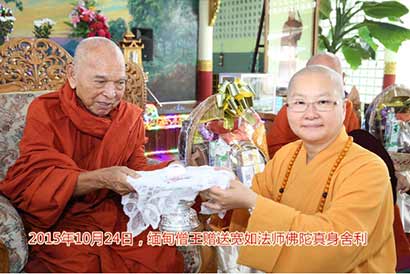 缅甸僧王赠送宽如法师佛陀真身舍利(图片来源:中国日报网)
